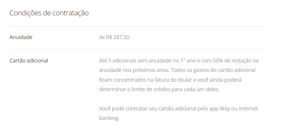 - Todos os gastos dos cartões adicionais são centralizados na fatura do titular, e você pode definir o limite de crédito de cada um diretamente pelo app Way ou internet banking.