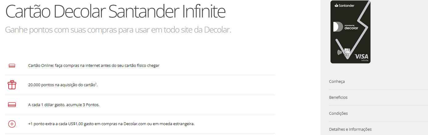 Eu já tenho o cartão Decolar Santander Infinite e recomendo demais! Os 20.000 pontos de boas-vindas já me ajudaram a emitir uma passagem.