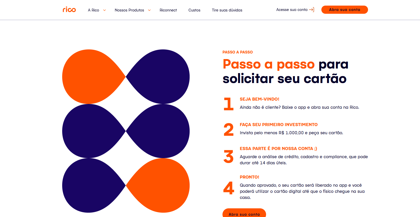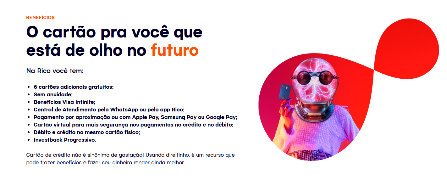 O cartão Rico é ótimo para quem está começando no mundo dos investimentos e quer algo sem anuidade.