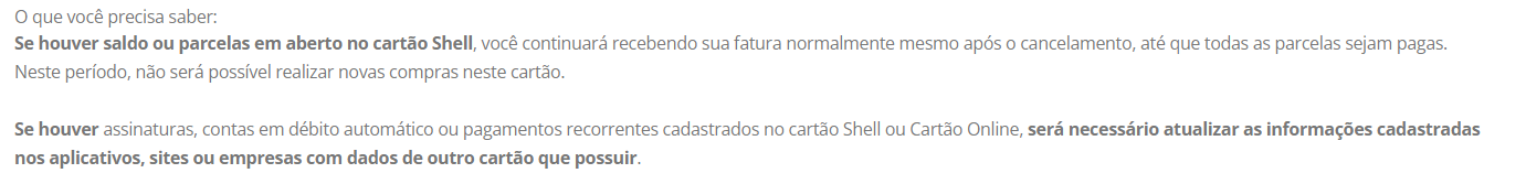 Todos os benefícios ligados à Shell foram cancelados. Se você ainda tem faturas a pagar ou parcelas em aberto, o banco vai continuar enviando as cobranças até tudo ser quitado.