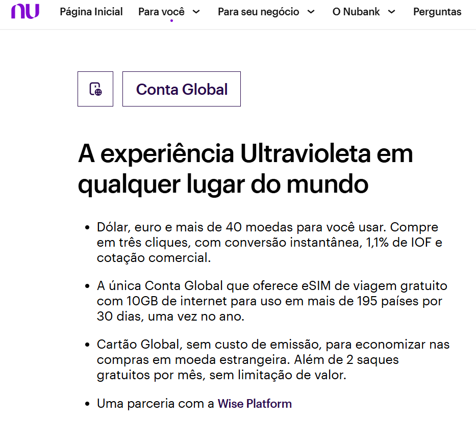 Um dos motivos que me fez escolher o Nubank Ultravioleta foi a simplicidade no uso. Tudo é integrado no app, desde a Conta Global até a gestão de benefícios.