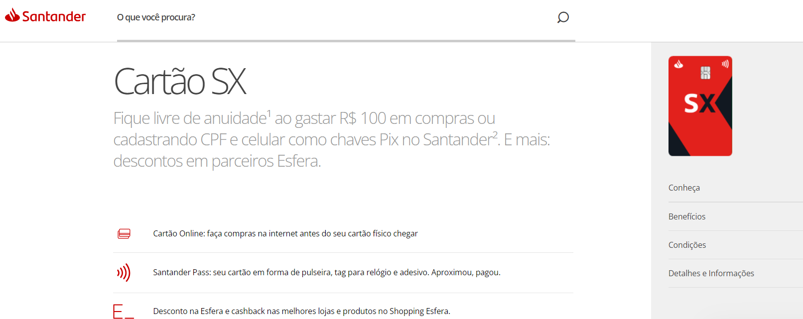 Eu estou procurando um cartão de crédito para usar em compras on-line e vi o Santander SX. Alguém sabe se é bom? Ouvi dizer que eles têm uma taxa de juros baixa, mas eu não sei se isso é verdade.
