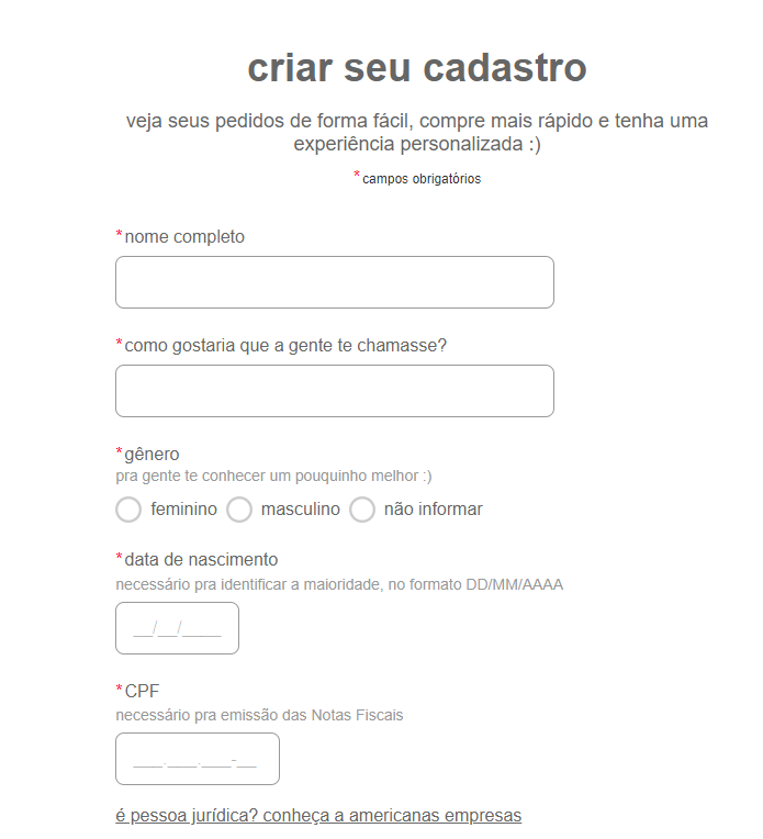 É só entrar no site das Lojas Americanas e clicar em “Cadastre-se”. Daà é só preencher com seus dados e criar uma senha. Bem simples!