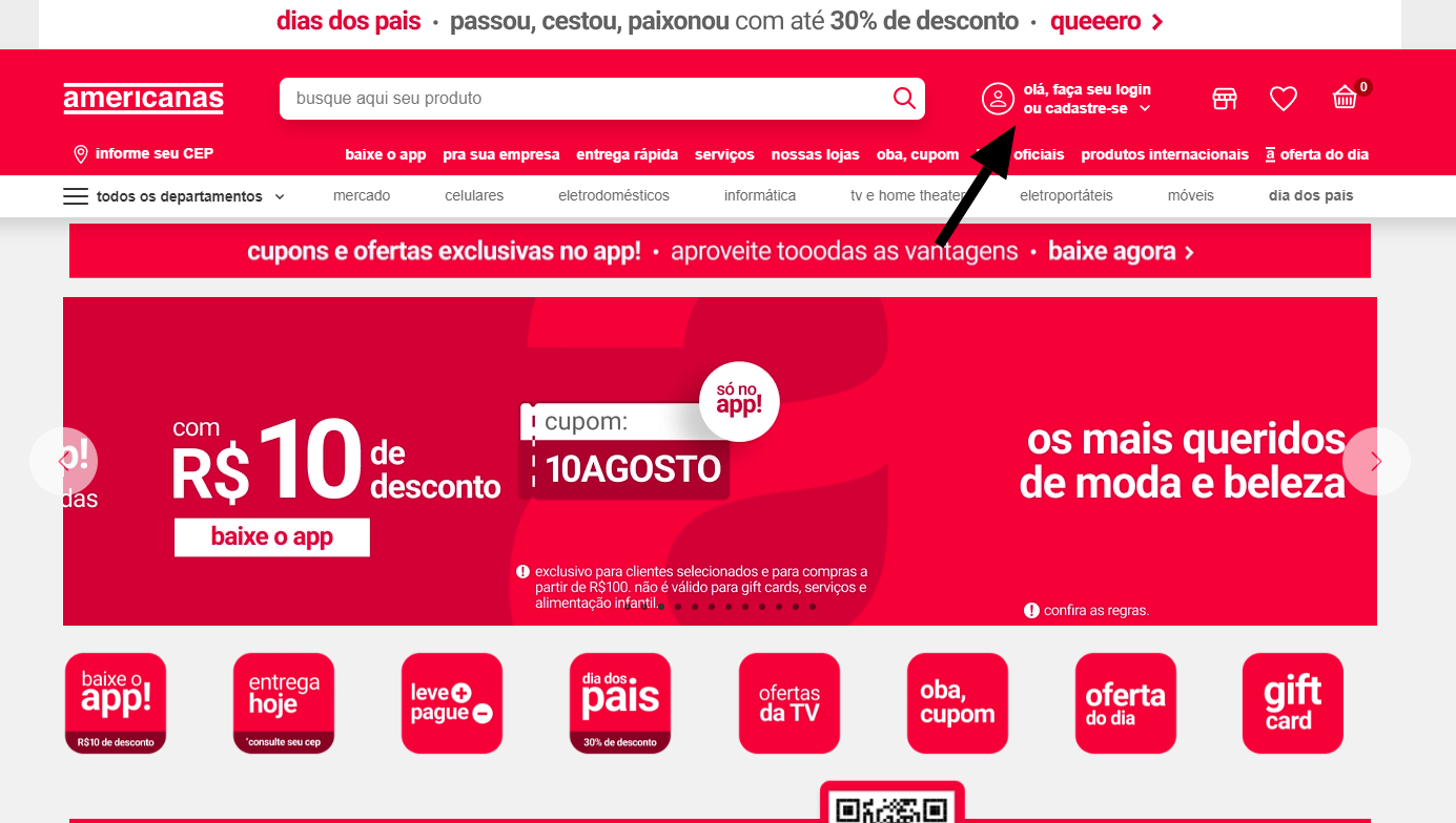 Pra abrir uma conta nas Lojas Americanas, é só você ir no site ou no app e clicar em “Entrar” e depois “Cadastre-se”.