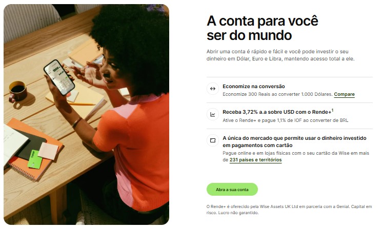 | Wise | Conta multimoeda | Sim | 40+ moedas | Cartão internacional | Não | Câmbio competitivo, taxas claras e remessas rápidas | Quem movimenta várias moedas |