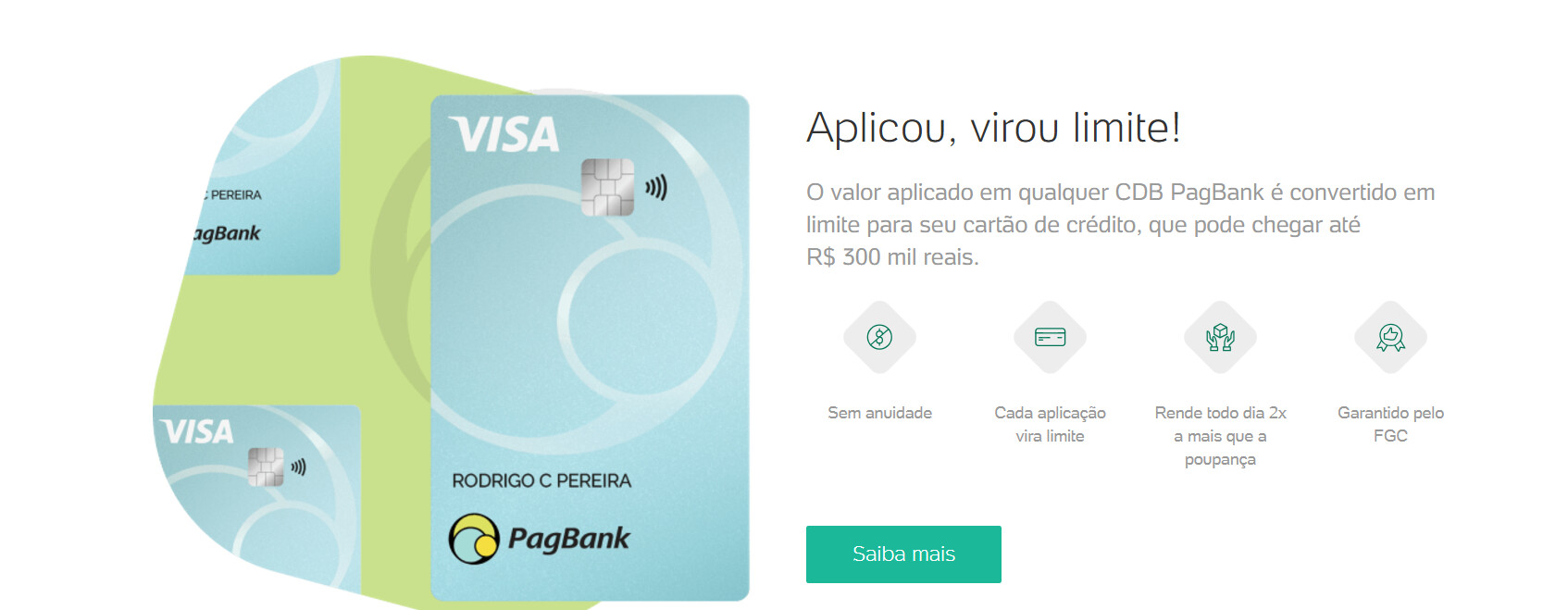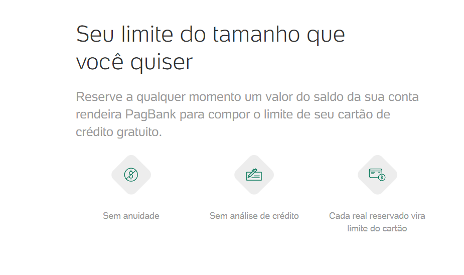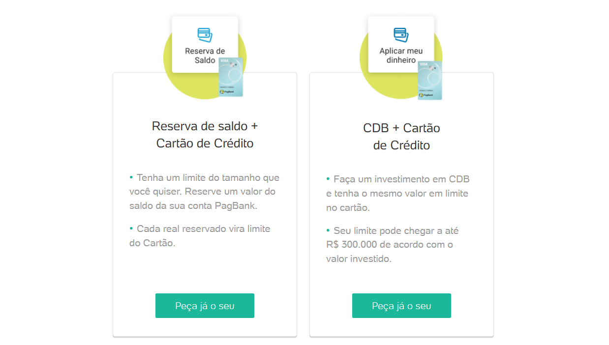 Para ativar o crédito, você precisa reservar parte do saldo da sua conta ou investir a partir de R$ 300 em CDBs oferecidos pelo PagBank. Este valor será convertido em limite para o cartão.
