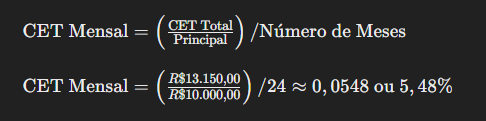 Para encontrar o CET mensal, divide-se esse total pelo montante principal e pelo número de meses do empréstimo: