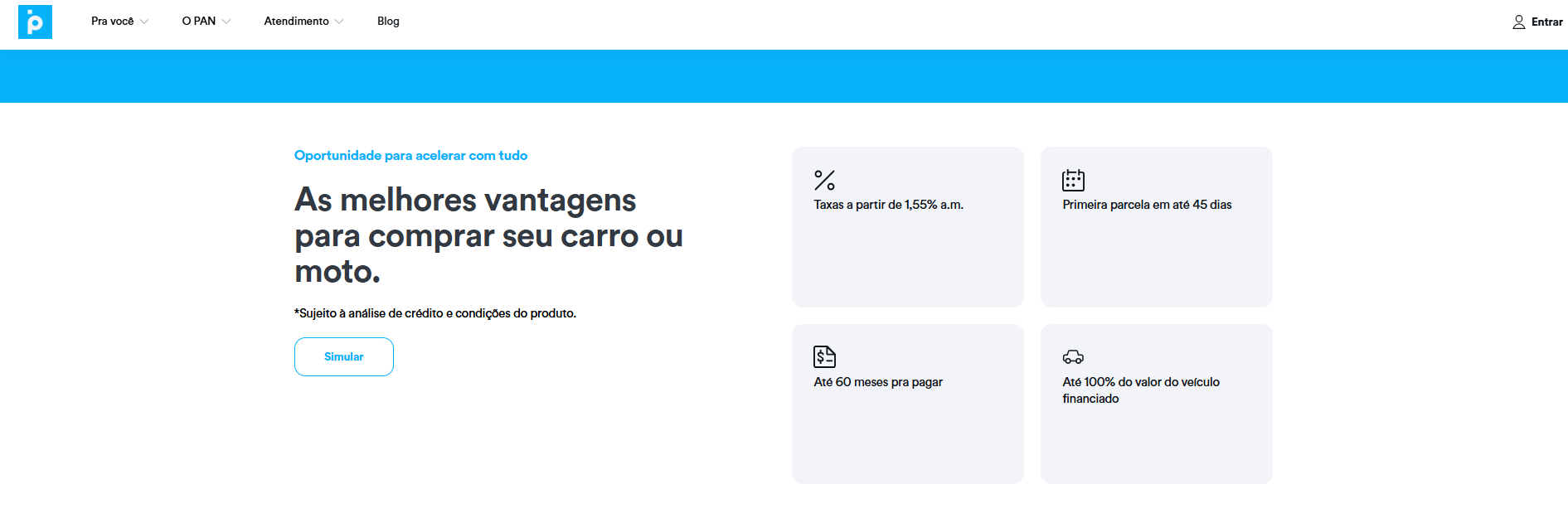 Banco PAN : Financiamento de até 100% do valor do veículo, com prazo de pagamento de até 60 meses.