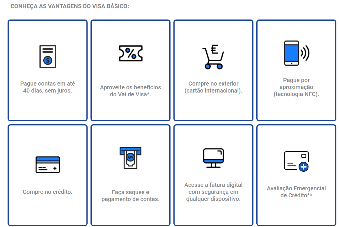 - Visa Básico: cartão ideal para quem busca um cartão simples e sem complicações.