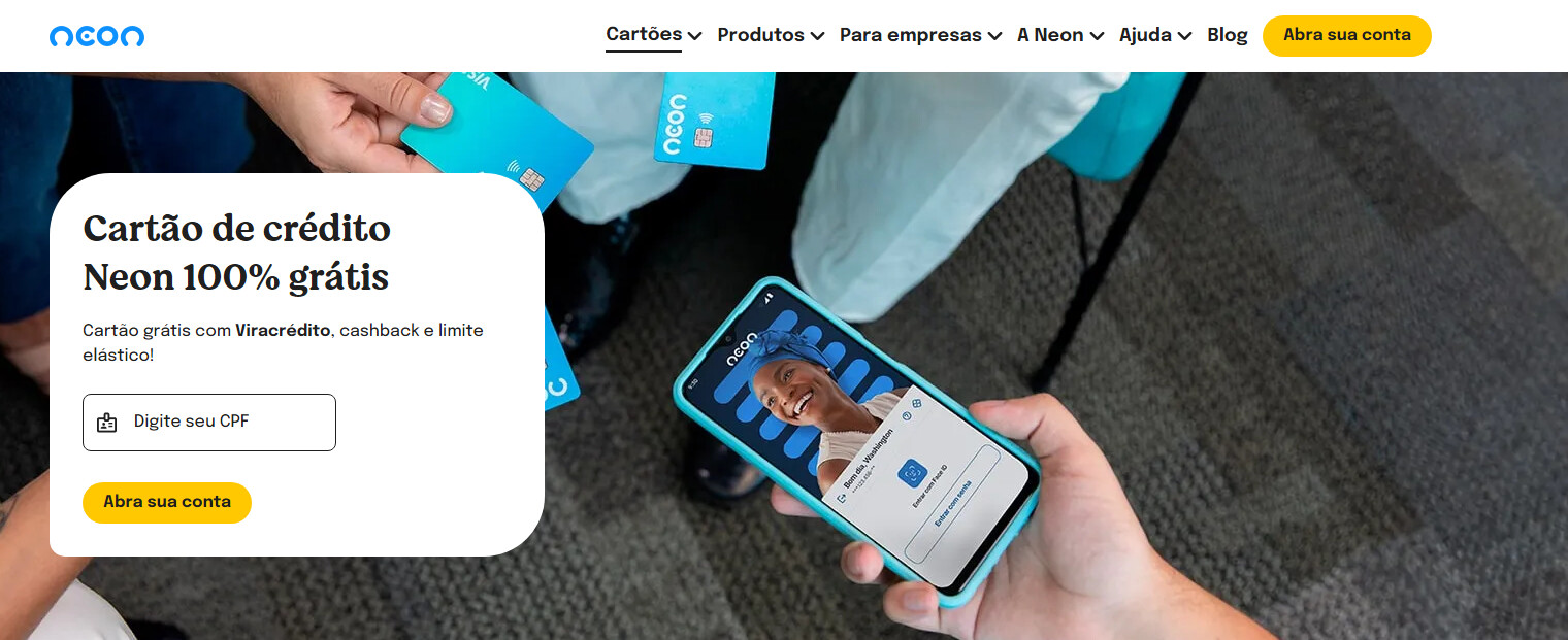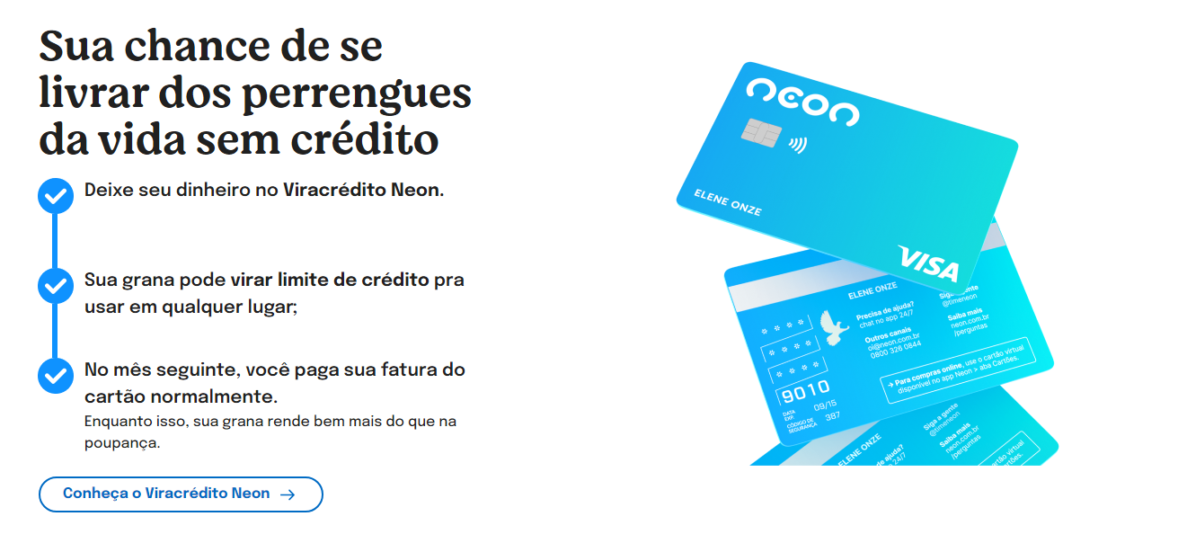 Pra conseguir o Cartão de Crédito Neon, baixa o app deles e abre uma conta. Depois, é só solicitar o cartão pelo app mesmo. Super fácil!