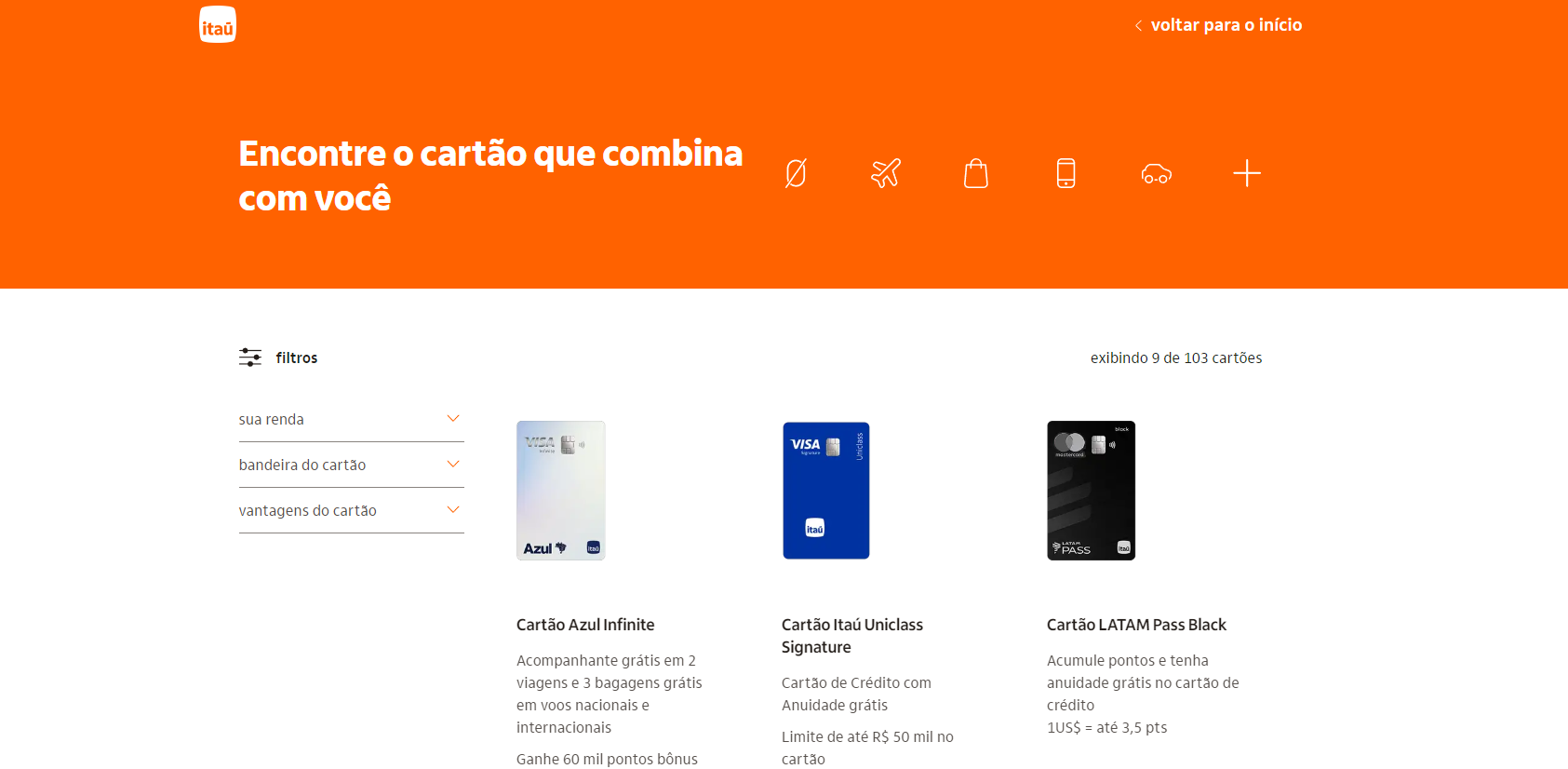 Itaucard 2.0: Oferece benefícios como descontos em cinemas, teatros e restaurantes, além de programa de pontos para trocar por produtos ou milhas aéreas.