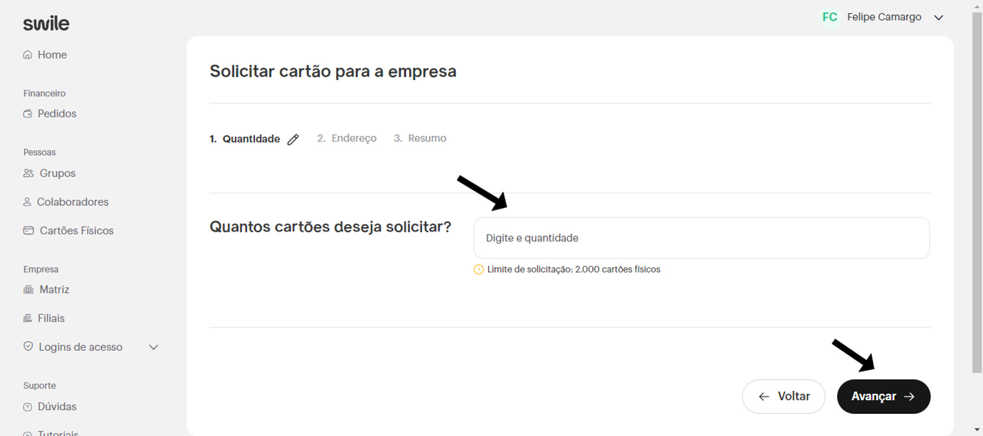 Acesse sua Dash RH, no menu lateral clique em Cartões Físicos, no canto superior direito clique em Solicitar Cartão, para o colaborador .