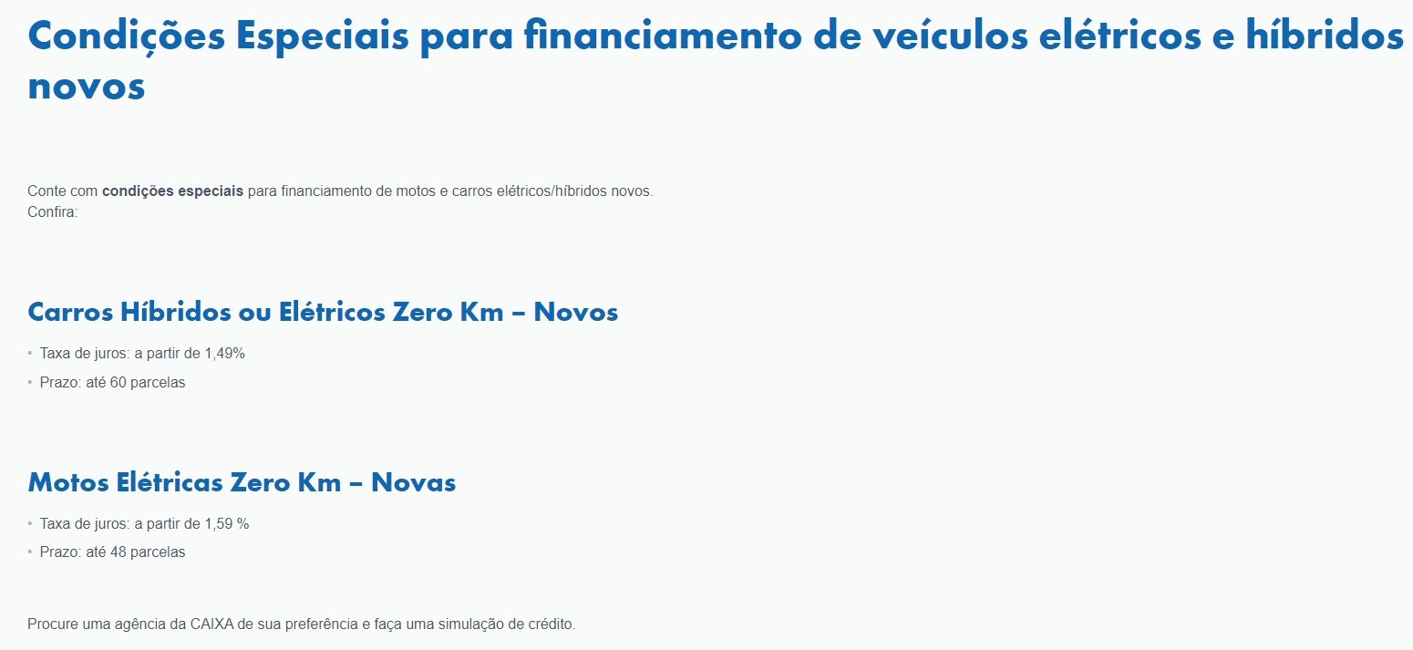 Se você está interessado em carros híbridos ou elétricos zero km, a taxa de juros também começa a partir de 1,49% e o prazo pode ser de até 60 parcelas.