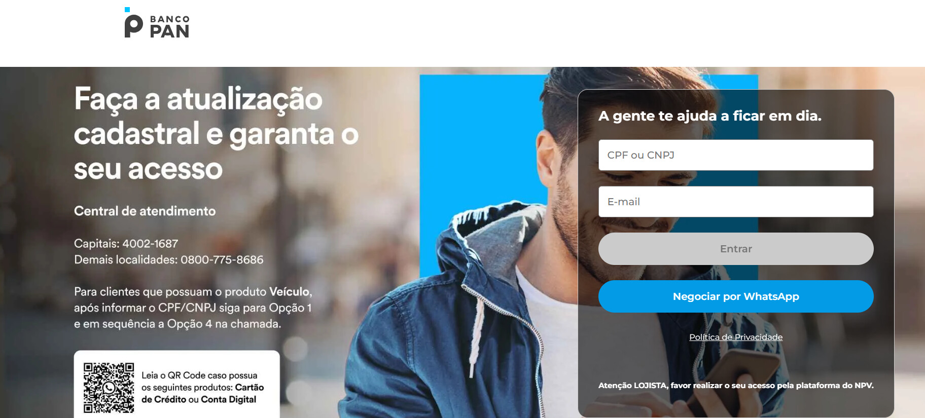 Mas tem um jeito mais fácil também, que é pelo Banco Pan WhatsApp é só mandar uma mensagem para (11) 4003-0101 para saber sobre sua proposta de empréstimo ou informações de financiamento.
