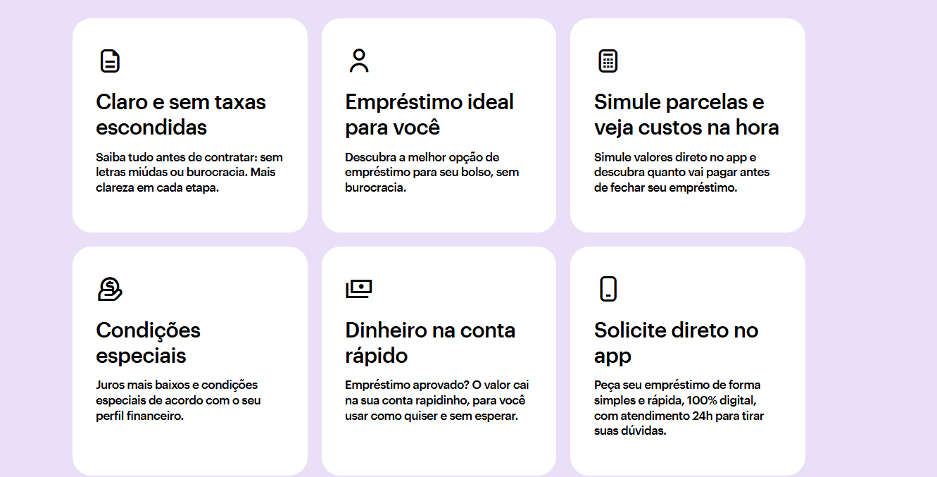 Quando cliquei para contratar, fui redirecionado para o aplicativo do Nubank, revisei tudo com calma e finalizei com poucos toques. Em menos de 24 horas o dinheiro já estava na conta. Achei bem prático e transparente. Recomendo.