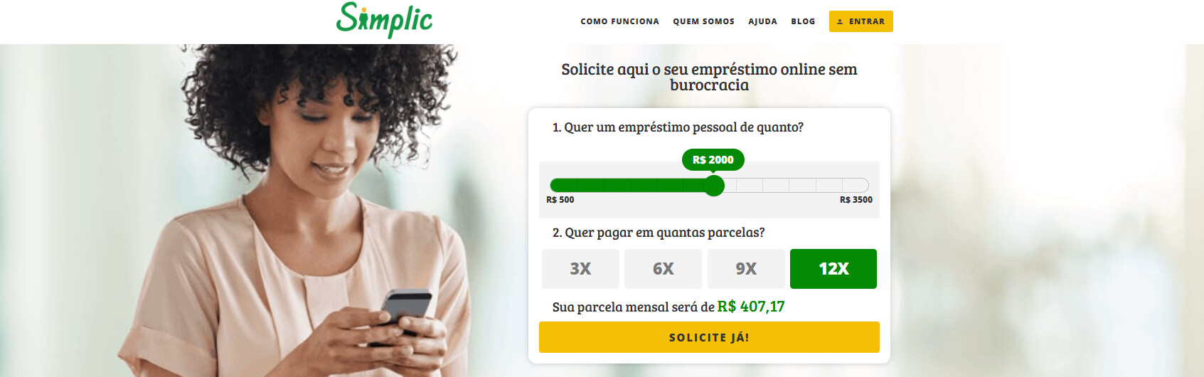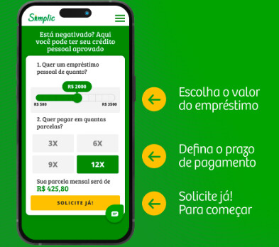 Olha, o empréstimo pessoal da Simplic é 100% online, rápido e sem burocracia. Em poucos passos, você pode solicitar valores entre R$ 500 e R$ 3.500, com prazos de pagamento de 3 a 12 parcelas fixas.