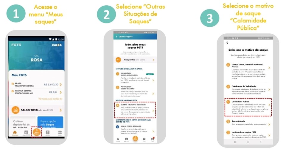 O processo começa com a prefeitura local comunicando a Caixa Econômica Federal sobre a situação. Depois, você precisa comprovar que mora na área afetada e que seu endereço está registrado no FGTS. Para isso, vale conta de luz, água, telefone, entre outros. O valor do saque depende do saldo que você tem na conta do FGTS, mas tem um limite, que geralmente é em torno de R$ 6.220.