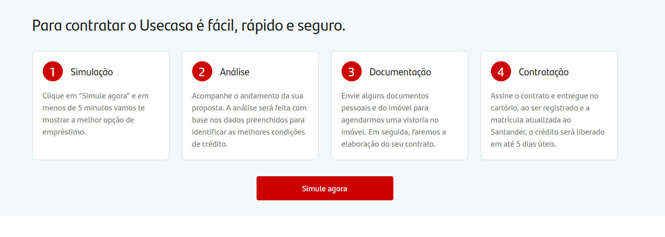 Oi, tudo bem? O empréstimo com garantia de imóvel do Santander, chamado Usecasa, é uma excelente opção para quem busca um crédito com taxas de juros mais baixas e prazos mais longos para pagamento.