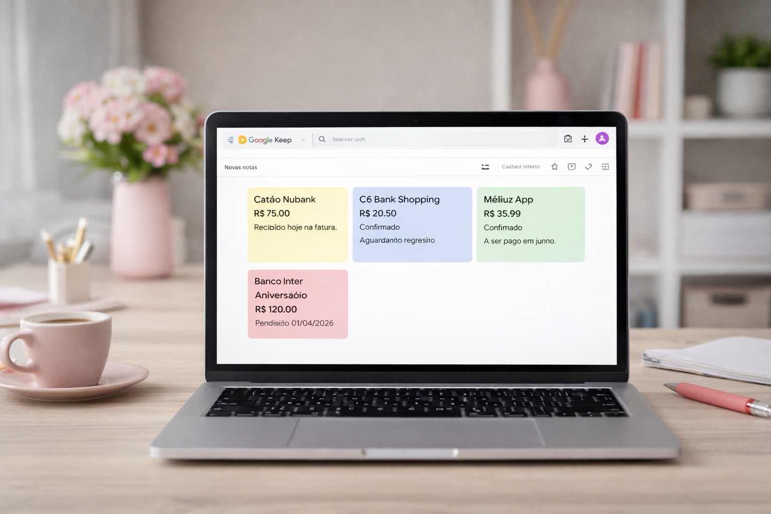 Cada nota tem os valores e a data prevista. Quando o cashback cai, eu marco como concluído e registro no app do banco. Não é nada sofisticado, mas é rápido, prático e evita que valores pequenos se percam com o tempo.