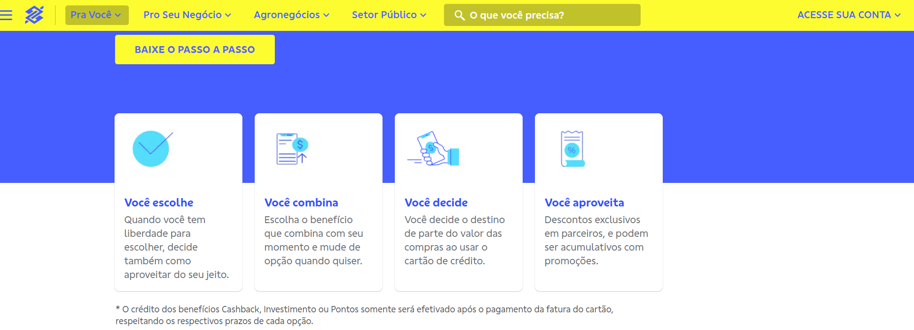 Você pode resgatar seu cashback pelo site ou app do Banco do Brasil. Siga o passo a passo: