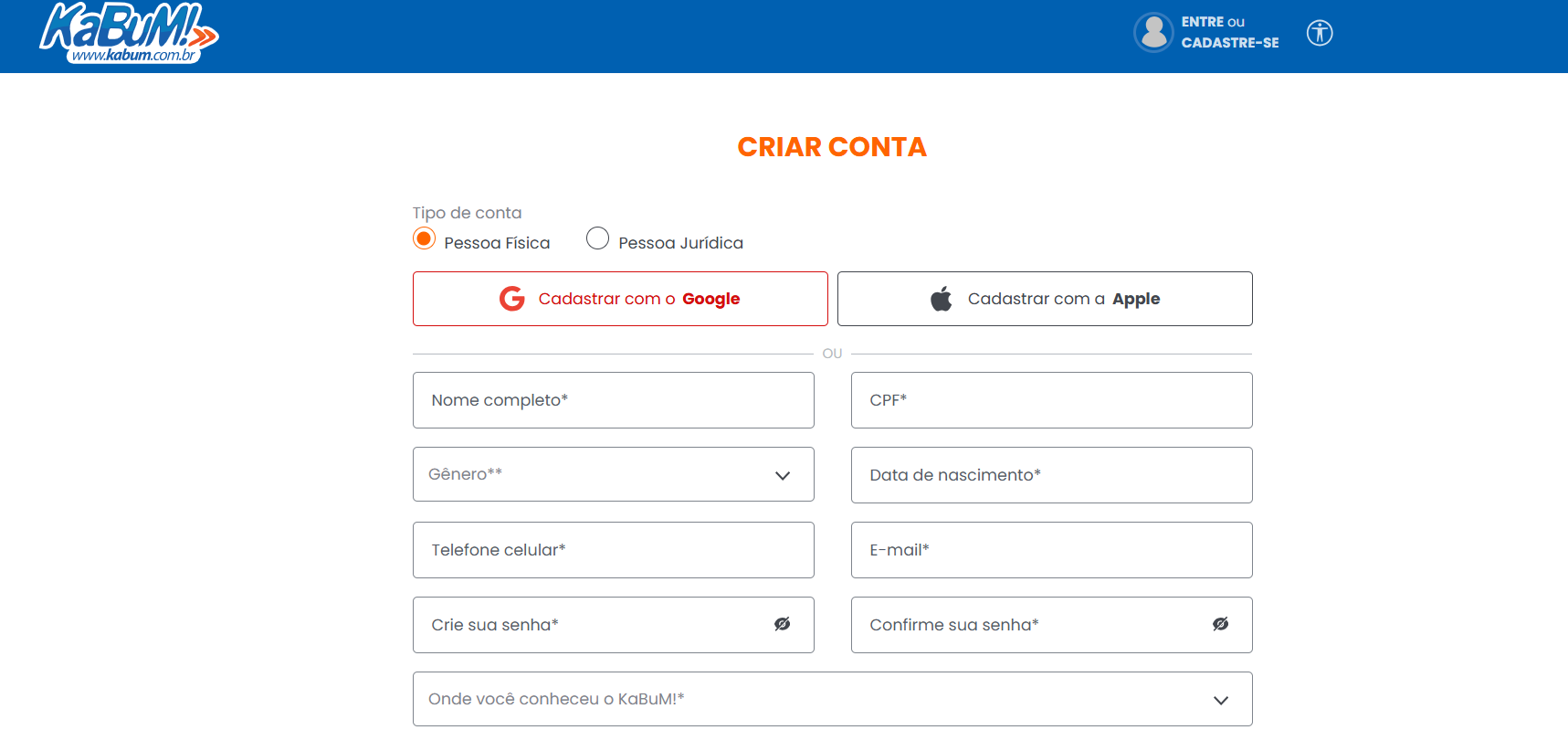 - Faça login na sua conta KaBuM! ou chore uma nova conta.