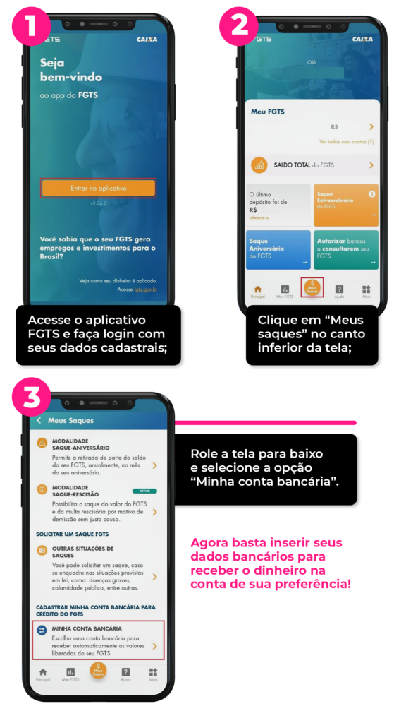 Mas de maneira geral você entra na sua conta do FGTS, vá em “Meus Saques”, escolha “Minha Conta Bancária” e coloque suas informações para receber o valor!