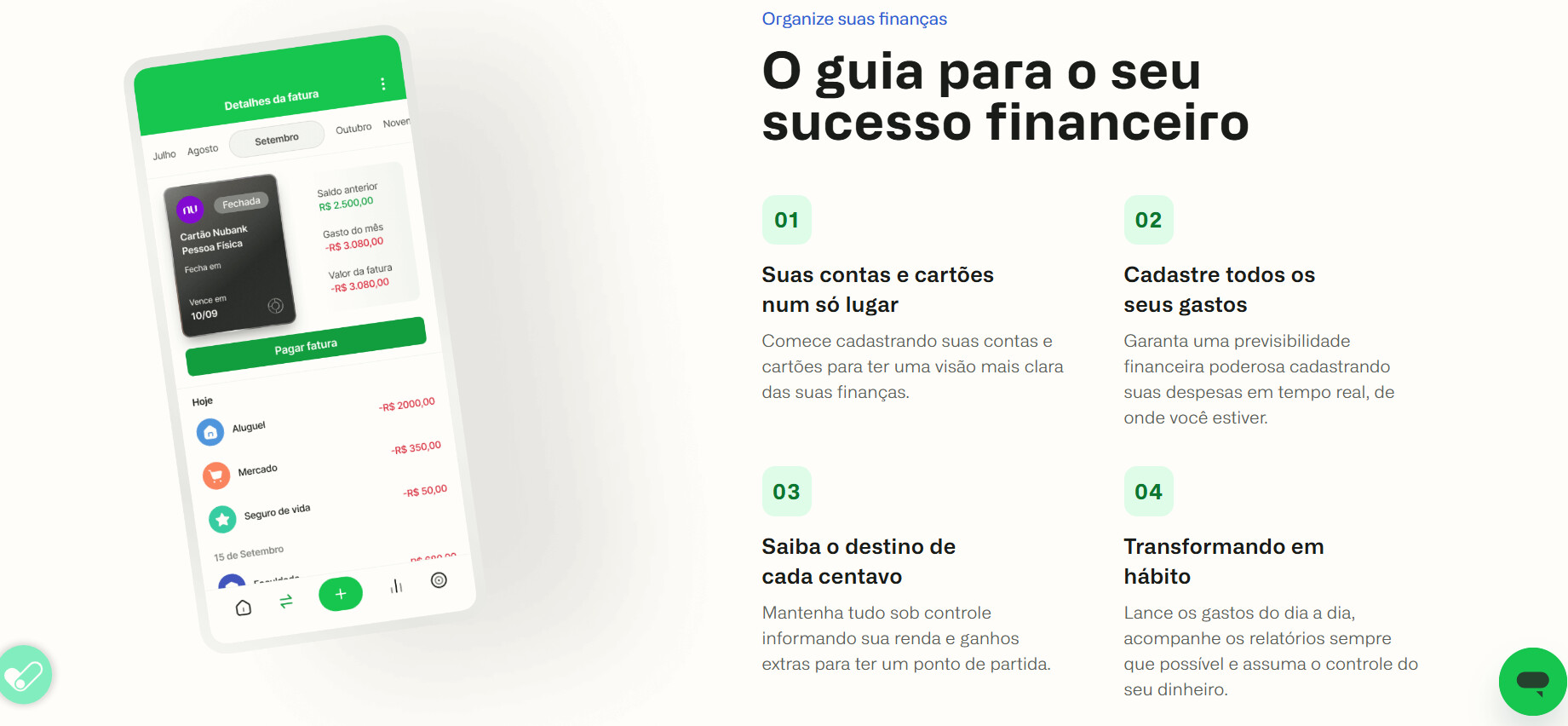 Destaque: integração com cartões de crédito para controle detalhado dos gastos.