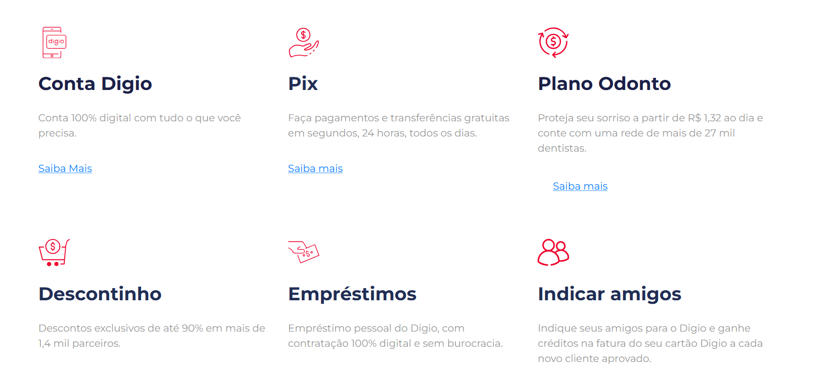 Além disso, o Digio oferece empréstimo consignado, que pode ser solicitado por trabalhadores registrados na CLT, funcionários públicos, aposentados, pensionistas, beneficiários do Benefício de Prestação Continuada (BPC) e militares ativos e inativos.