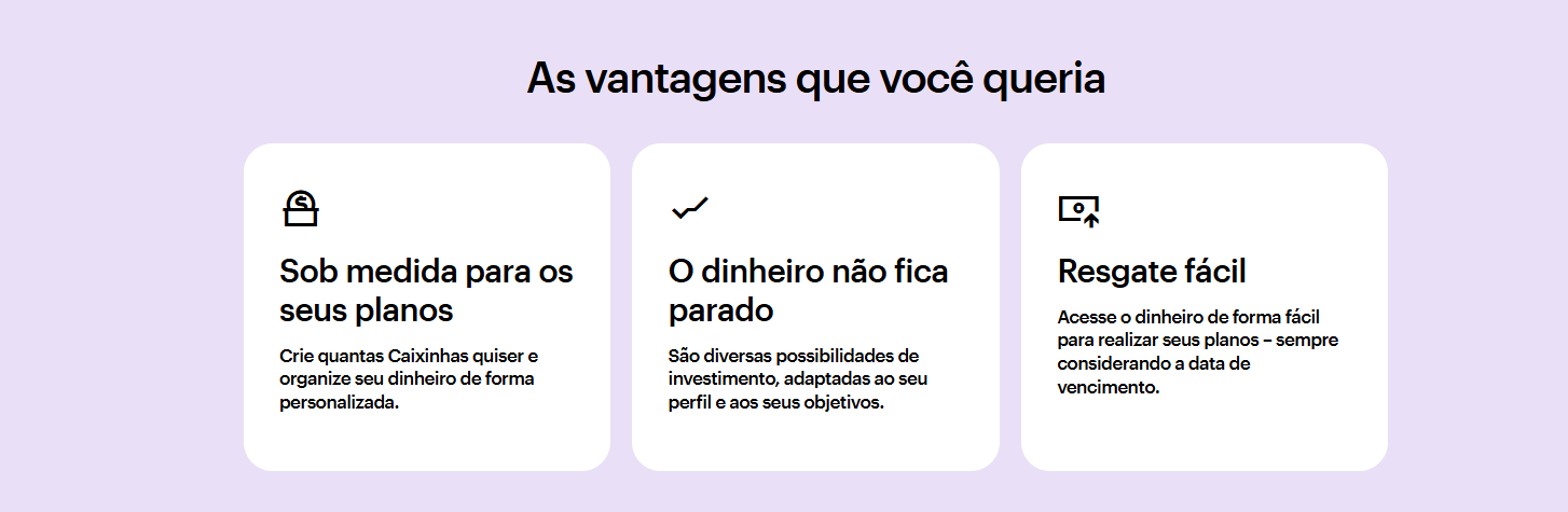Eu uso bastante a caixinha do Nubank. O que me atraiu foi a possibilidade de deixar o dinheiro rendendo desde o primeiro dia útil, diferente da função “Guardar Dinheiro” que só começa a render depois de 30 dias.