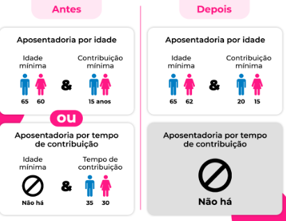 | Idade Mínima para Aposentadoria | 65 anos para homens / 62 anos para mulheres |