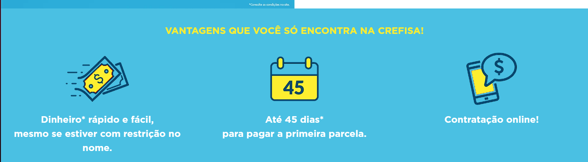 | Como iniciar? | Pela internet, no aplicativo ou presencialmente em uma agência da Crefisa. |