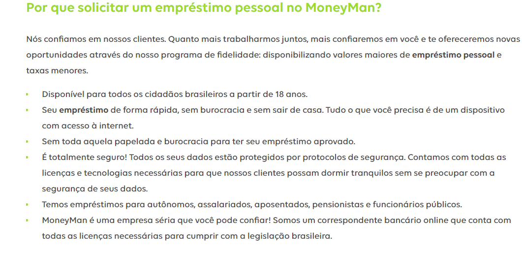 Importante: A MoneyMan é um correspondente bancário e não solicita qualquer tipo de depósito prévio ou garantia para análise de crédito ou liberação dos valores de empréstimos online.