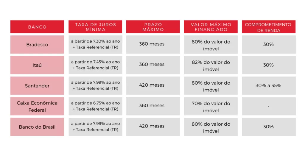 Alguns dos bancos que costumam oferecer boas condições para financiamentos são: