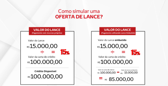 Lance embutido: quando você usa parte do seu próprio crédito contratado para dar o lance. Nesse caso, se o valor da sua carta for R$ 50 mil e você der um lance embutido de R$ 10 mil, você será contemplado com um crédito líquido de R$ 40 mil, e os R$ 10 mil vão abater o saldo do seu consórcio.