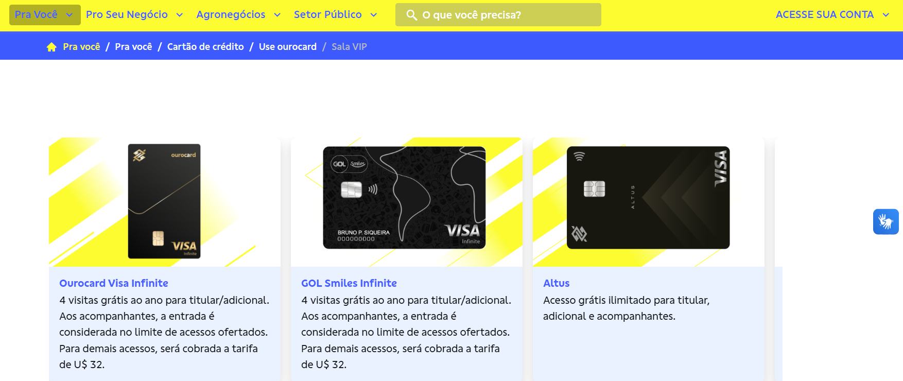 Sou cliente do Banco do Brasil e tenho o Ourocard Visa Infinite, esse cartão me dá 2 acessos gratuitos por ano às salas VIP, o que tem sido ótimo para as minhas viagens internacionais.