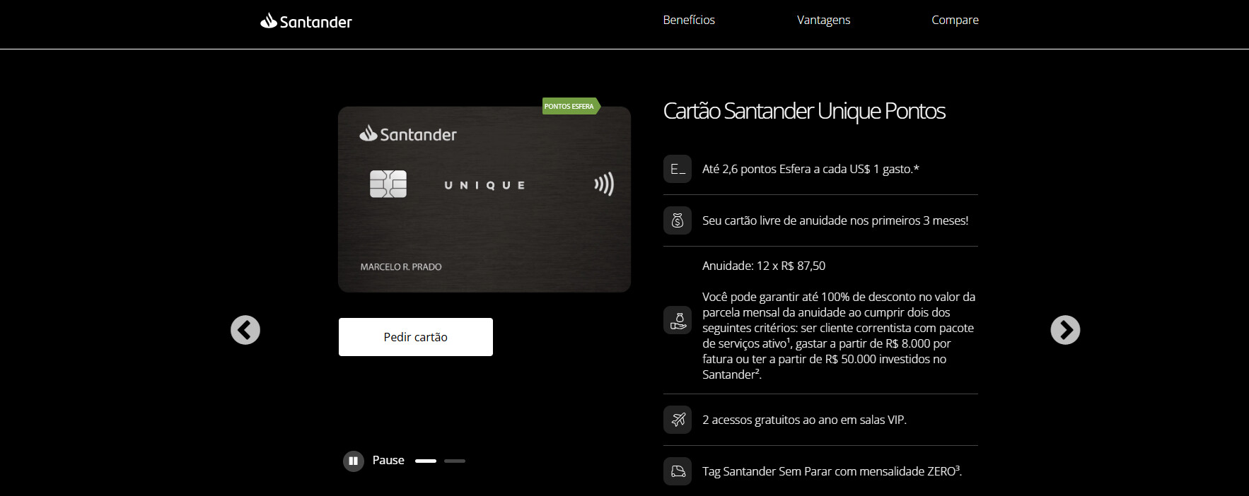 Pessoal, sou cliente do Santander e tenho o Santander Unlimited Visa Infinite, a grande vantagem desse cartão é que ele oferece acesso ilimitado às salas VIP, além de 8 visitas gratuitas para acompanhantes durante o ano.