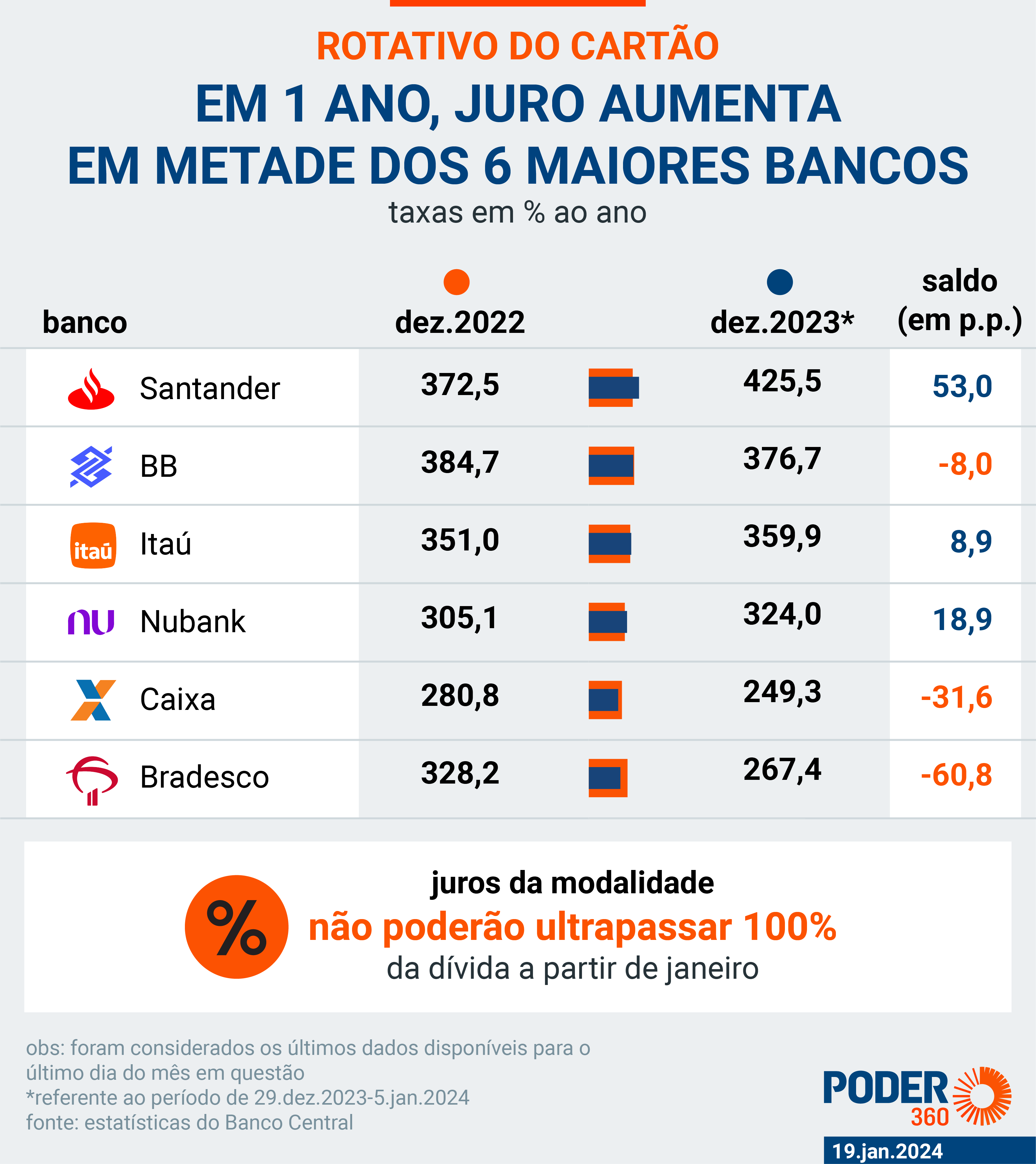 Esses juros são bem mais altos do que a gente costuma ver em outras formas de crédito. Só pra você ter uma noção, nessa imagem tem algumas informações sobre o juros do rotativo do cartão de algumas instituições: