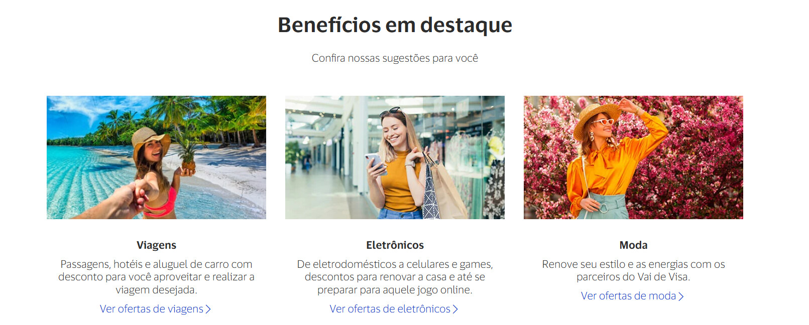 Por exemplo, a Visa tem o programa Vai de Visa , que oferece descontos em várias lojas e ainda permite apoiar causas sociais com suas compras.
