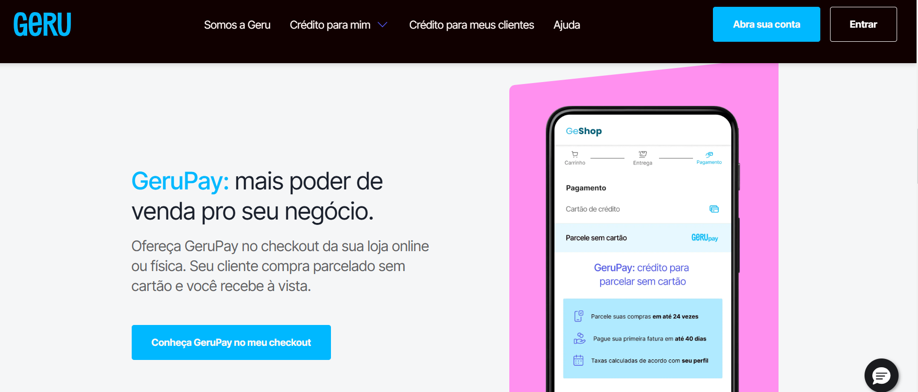 Se você está buscando crédito rápido para sua empresa, uma boa opção pode ser o GeruPay , uma solução 100% digital que permite comprar parcelado sem precisar de cartão. Ela oferece uma experiência simples e rápida, com a possibilidade de pagar via Pix.