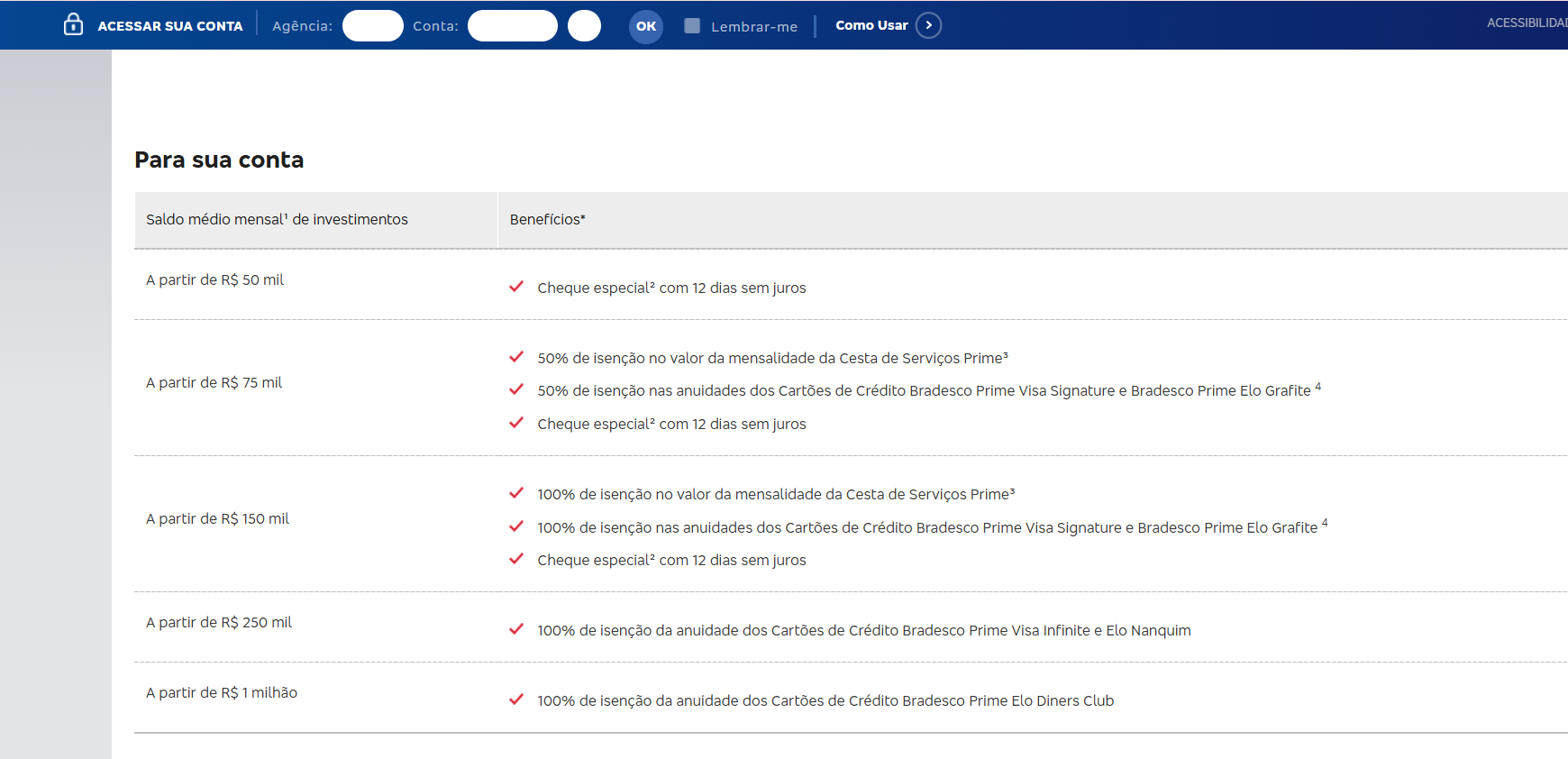 Quando fui atrás do Bradesco Prime, eu já sabia que precisava de uma renda mensal acima de R$10 mil ou de pelo menos R$100 mil investidos no banco. No meu caso, usei a renda pra atender aos critérios. Achei o processo simples, só precisei enviar meus holerites e comprovantes de depósito mensal.