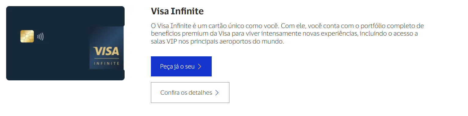 Pessoal, dependendo da versão do cartão, os benefícios podem variar bastante. Se você escolher, por exemplo, o Visa Infinite , você terá acesso a vantagens exclusivas, como concierge 24 horas, descontos em restaurantes e até serviços especiais de viagem.
