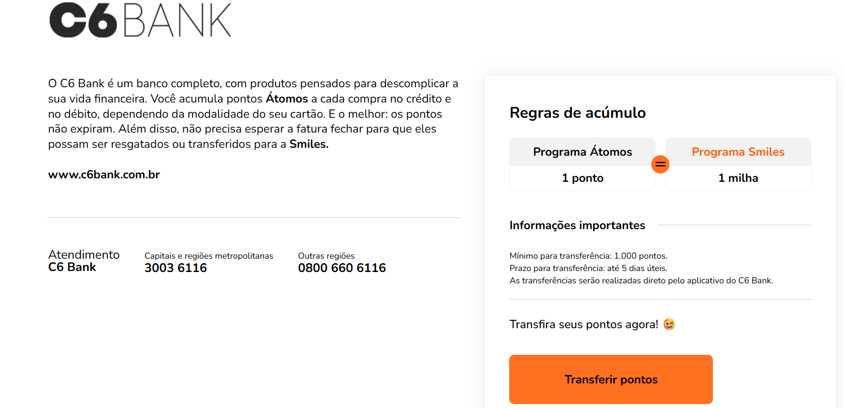 O C6 Bank é outra opção bem interessante, eles têm o programa chamado C6 Átomos, que acumula pontos não só para trocar por milhas, mas também para cashback e outras vantagens.