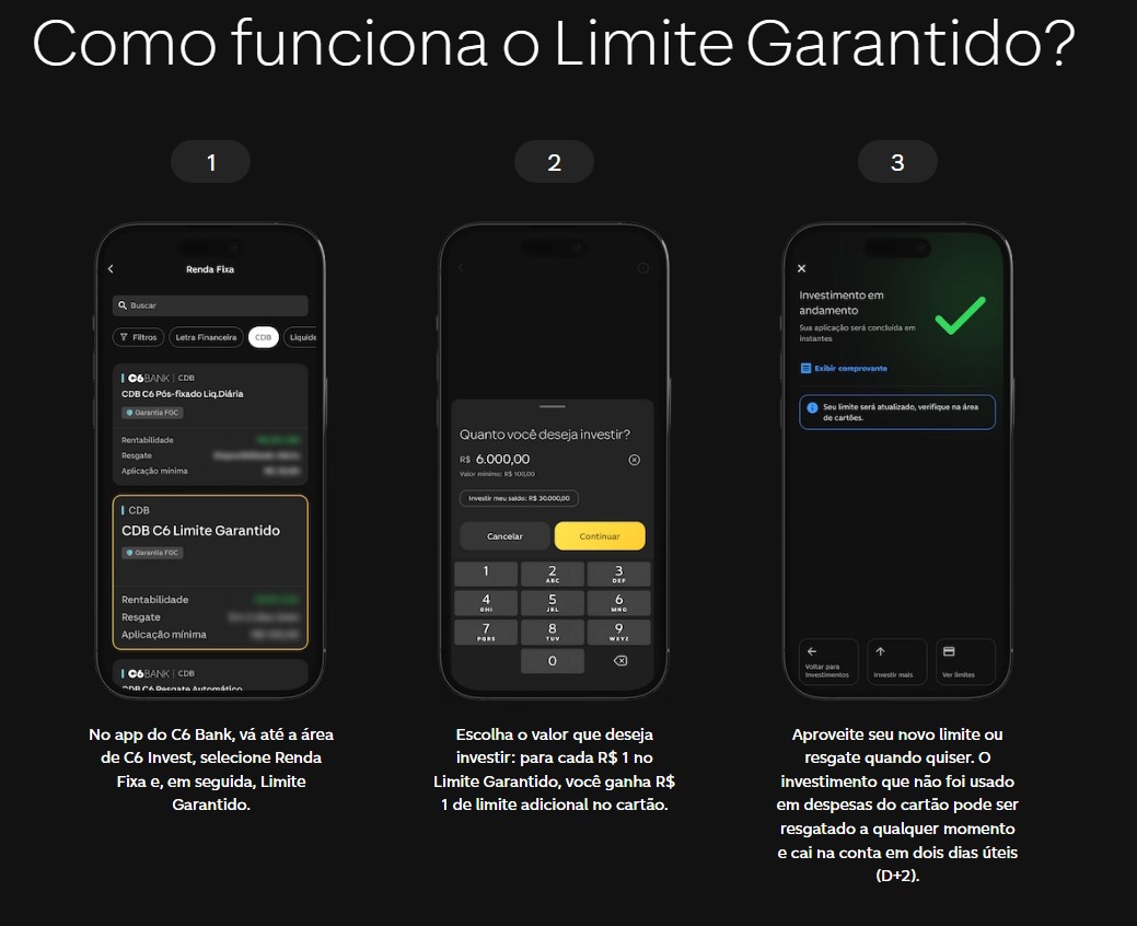 Uso o C6 Bank com CDB como garantia e achei uma solução bem inteligente. Você deposita o dinheiro, ele vira seu limite e ainda fica rendendo enquanto isso.