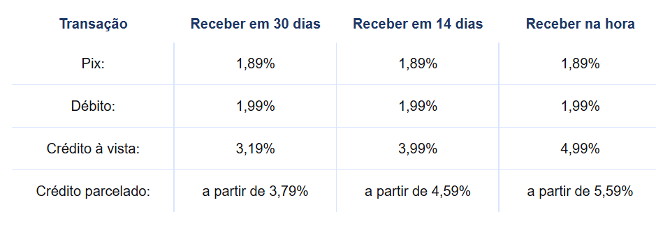 No débito, a taxa padrão é de 1,99%, e no crédito à vista, parte de 3,19% com recebimento em 30 dias. Essas taxas aumentam se o pagamento for parcelado, começando a partir de 3,79%.