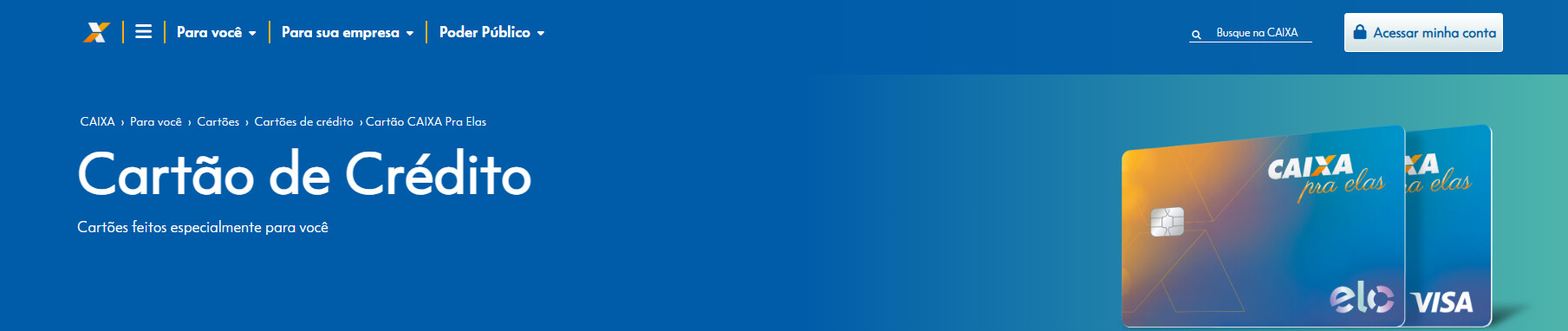 E para quem deseja um cartão mais exclusivo, o Cartão CAIXA Pra Elas é personalizado, pode ser solicitado com as bandeiras Elo ou Visa, e não tem anuidade.