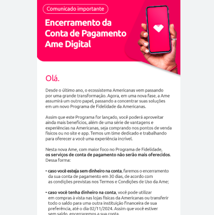 A Ame deixou de operar como conta de pagamento e agora se tornou um programa de fidelidade das Americanas, focado em benefícios e recompensas para os clientes, acesse o site oficial: Ame Digital .