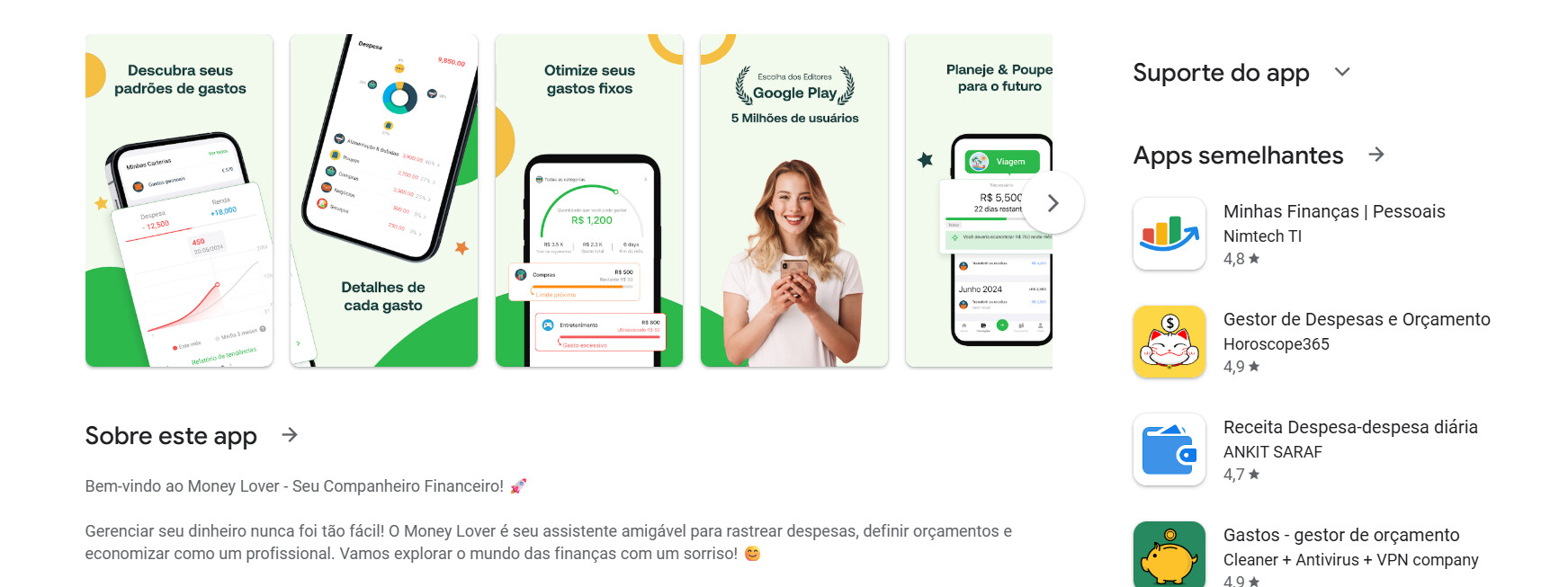 Também gosto muito das funcionalidades de metas e orçamento, porque me deixam mais focado no que eu posso gastar por categoria. A versão gratuita é boa para começar, mas recomendo a premium, porque tem muitos recursos extras que ajudam no planejamento financeiro de verdade.