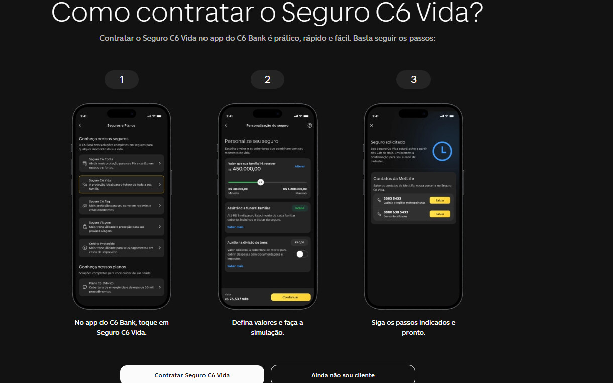 A carência varia entre 3 a 6 meses e a contratação é simples, com débito direto na conta do cliente. É uma excelente escolha para quem valoriza agilidade e conveniência digital.