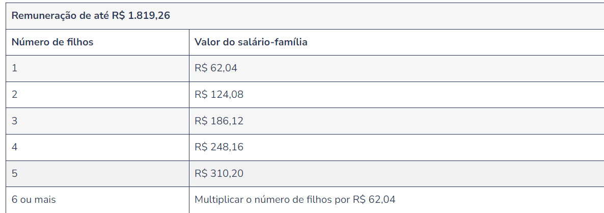 Em 2024, o salário-família passou a ser de R$ 62,04 para quem tem remuneração mensal de até R$ 1.819,26.