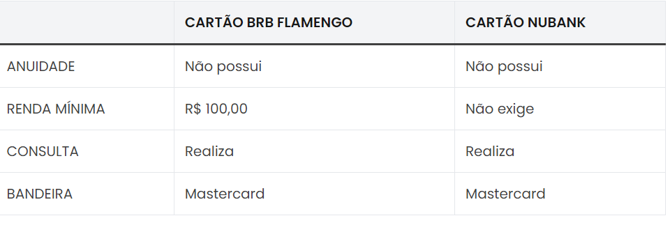 Olá! Estou querendo tirar um cartão de crédito e fiquei em dúvida entre o BRB Flamengo e o Nubank. Alguém pode me ajudar?